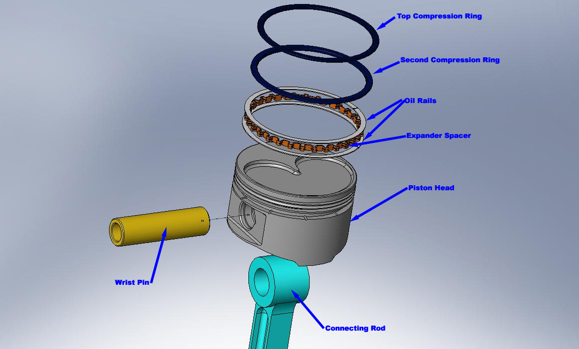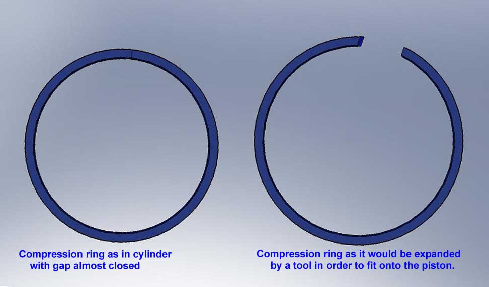 Figure 5: A close-up & sectioned view showing the compression ring contact with the combustion cylinder. Notice that the compression rings are not held rigidly within the piston head. There are gaps at the tops of each compression ring and there is also a gap between the inner diameter of each compression ring and the piston head.