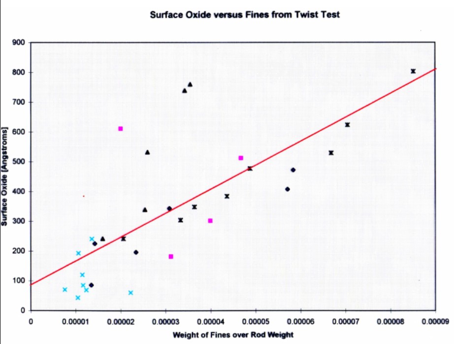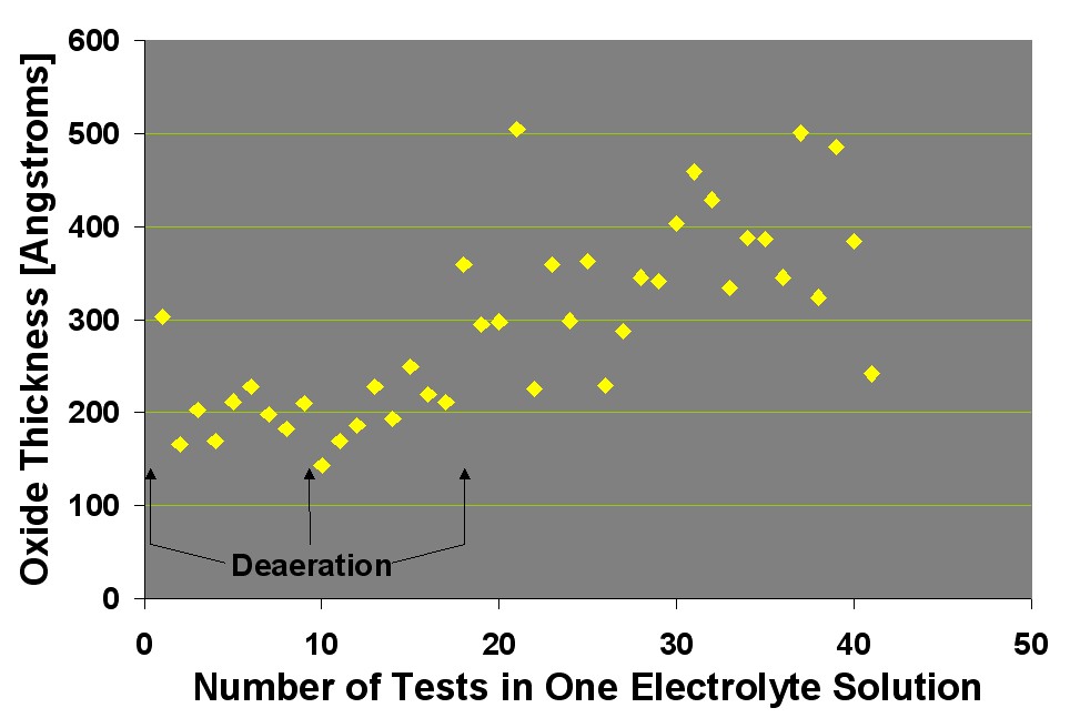 The figure above shows that after 17 tests in a small volume of electrolyte, the electrolyte must be replaced. The CI Surface Oxide Testers and the CSA use electrolyte volumes two times higher to decrease the frequency of electrolyte changes. On the other hand, the experiments represented in this figure had each rod sample solvent-cleaned, which is unlikely in QC labs. Deterioration of the electrolyte is may be associated with a change in pH, which decreased from its initial value of 11.2 to 10.5 after the forty-second test.