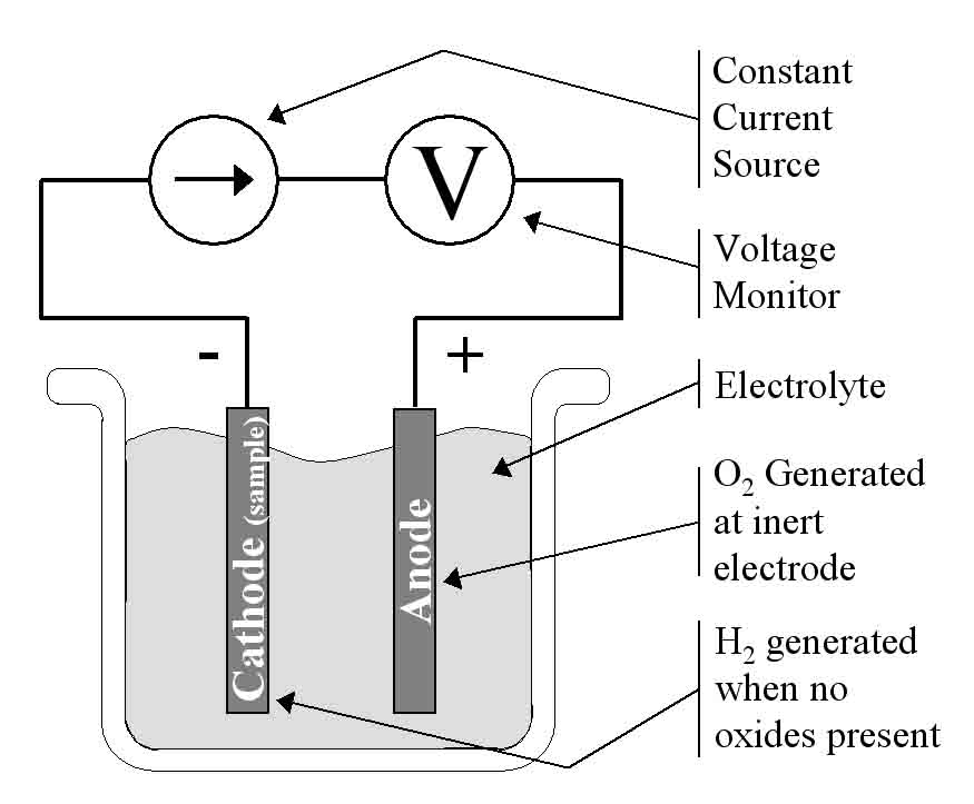 Figure 1: This is the simplest coulometric reduction cell where a constant current loop is created through the electrolyte. The cathode is the sample to be tested and a percentage of the hydrogen generated at the cathode goes towards reducing any oxides present.