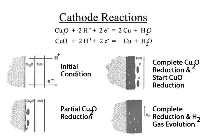 Figure 2: Hydrogen formed on the surface diffuses through the oxide layers and reduces the oxide to metal and water. In the case of copper the Cuprous (Cu2O) is reduced first and then the cupric (CuO). This is a very simplistic illustration. In fact, these two constituents are often present in a mixed layer. From Pops and Hennessy [2].