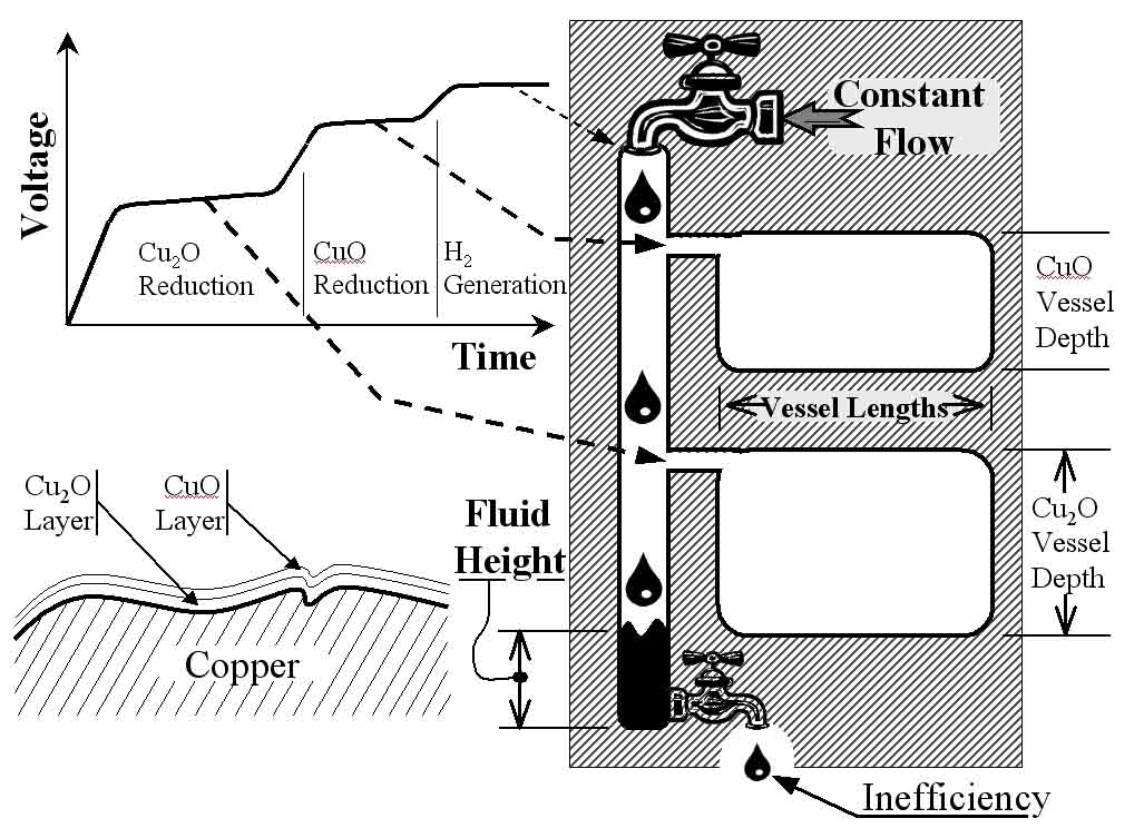 Figure 3: The upper-left shows a typical voltage-time curve generated by the surface oxide test. The plateaus in this curve correlate to the reduction of two layers of copper oxide as show in the lower-left. The curve can also be correlated to a mechanical analogy, shown at the right, to aid in understanding the test.