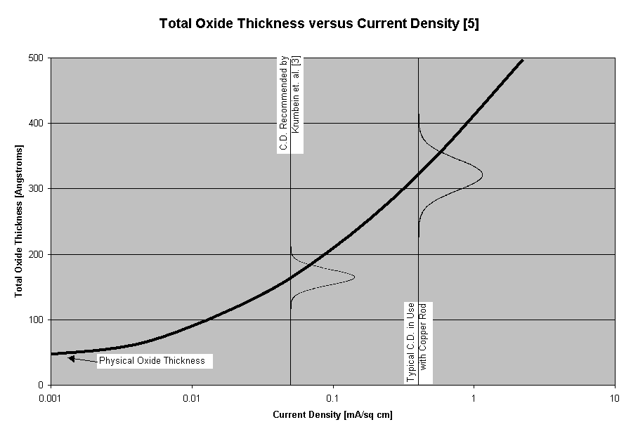Figure 4: At low levels of current density the actual physical oxide thickness� are accurately measured. As current density increases the oxide thickness measurements increase due to reduction inefficiencies. The two vertical lines illustrate current density recommended for corrosion samples and current density typically used on copper rod. The higher level doubles the oxide thickness readings. Representative normal distribution curves illustrate that the measurement variation is tighter at lower current density levels.