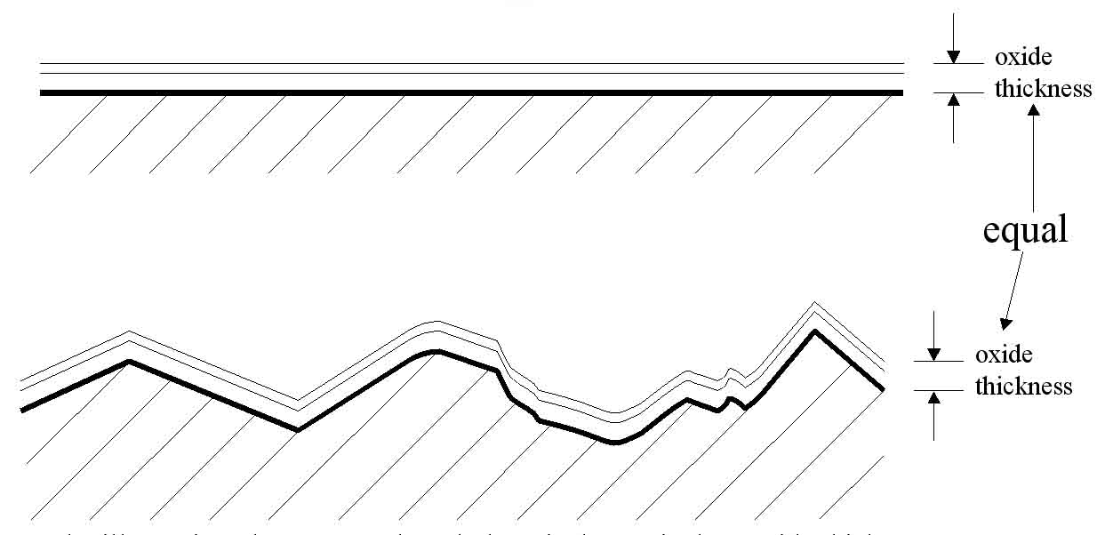 Figure 5: In the illustration above, even though there is the equivalent oxide thickness on both samples, the CR-only test will evaluate the bottom sample much higher because it has more real surface area.