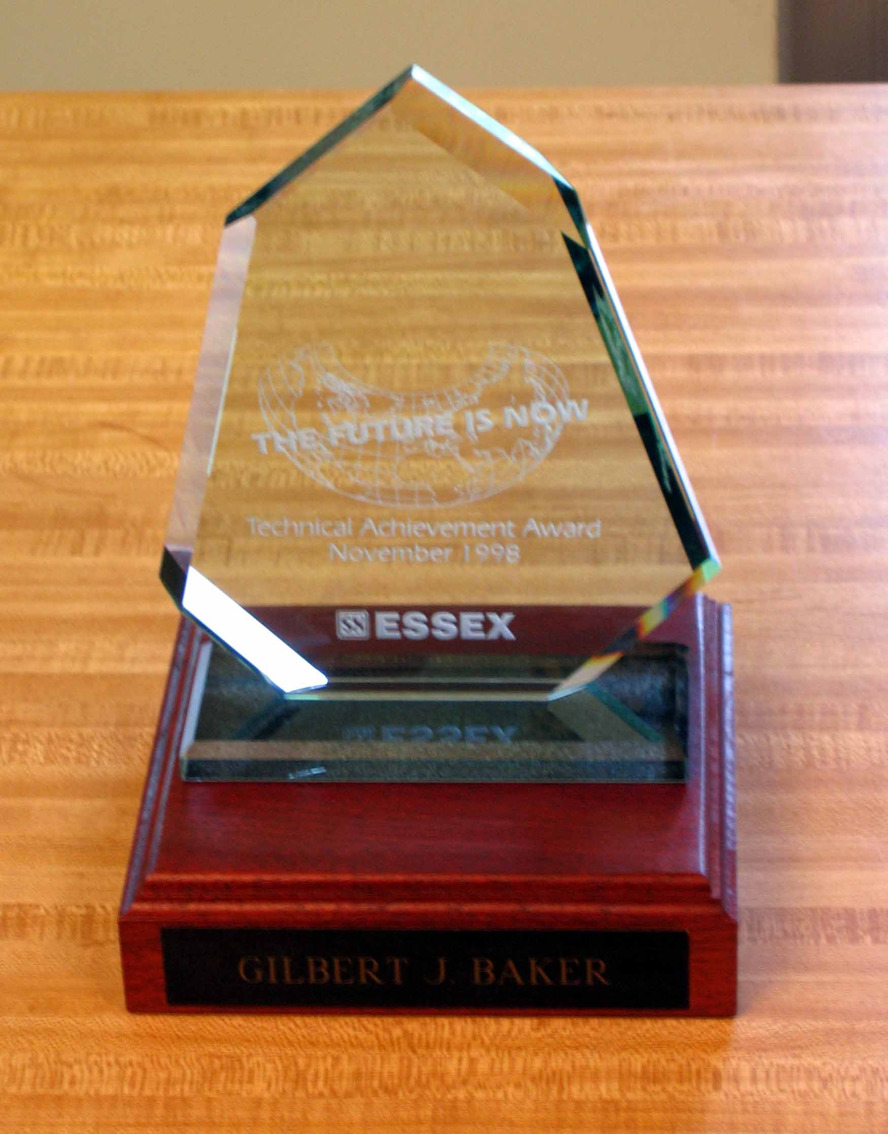 Vice President of Technology, Irv Adler (l) and CEO, Steve Abbott (r) congratulate Sr. Metallurgical Engineer, Gil Baker (middle), one of three winners of the Essex Technical Achievement Award for 1998.