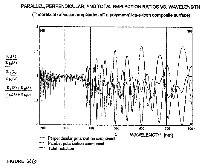 FIGURE 26: Parallel, Perpendicular, and Total Reflection Ratios versus Wavelength. (Theoretical reflection amplitudes off a polymer-silica-silicon composite surface.)